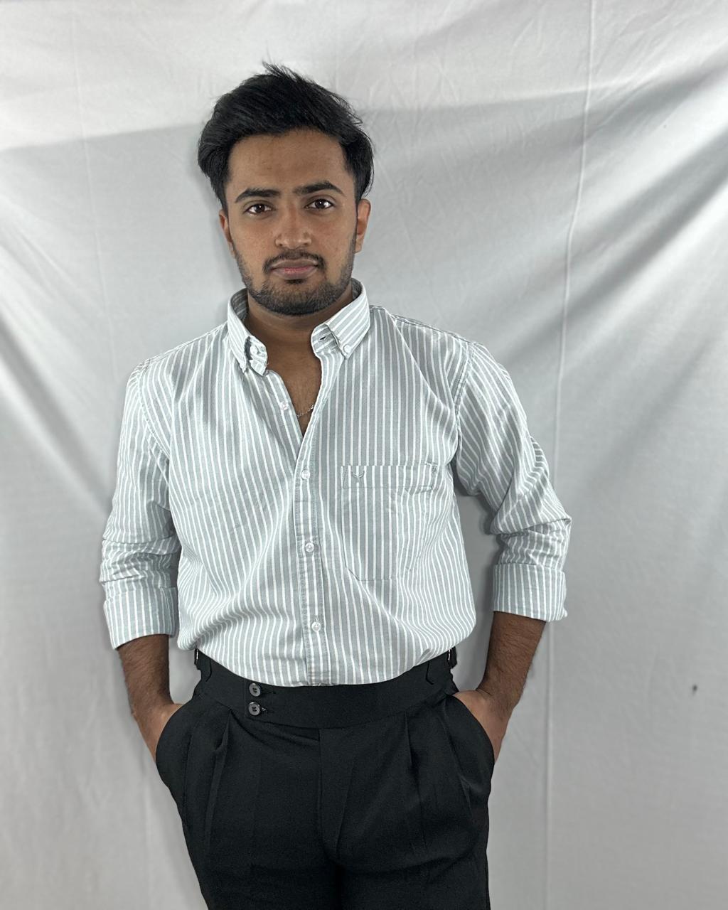 Ash grey oxford cotton-linen shirt with white stripes | button-down collar