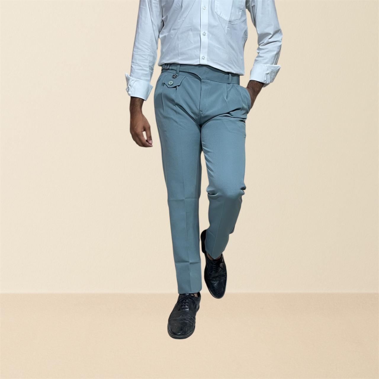 Men's pastel teal gurkha pants | premium formal trousers with single side buckle & pleated design