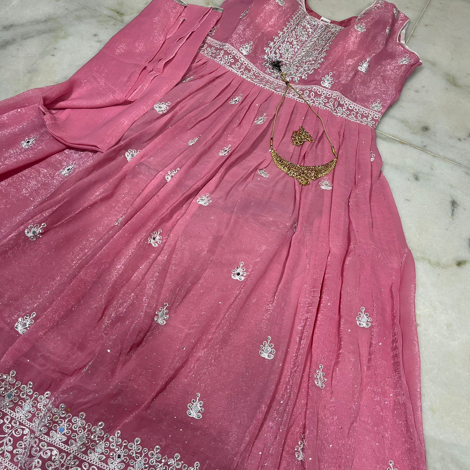 Rose pink embroidered silk anarkali suit with dupatta & pant