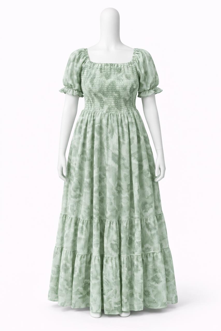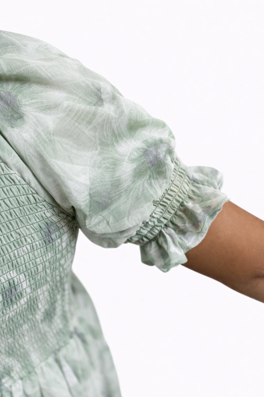 Women's Light Green printed sundress with puff sleeves