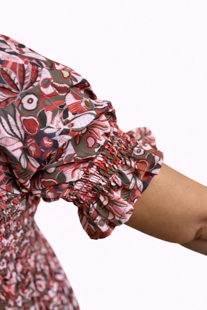 Women's Red printed sundress with puff sleeves