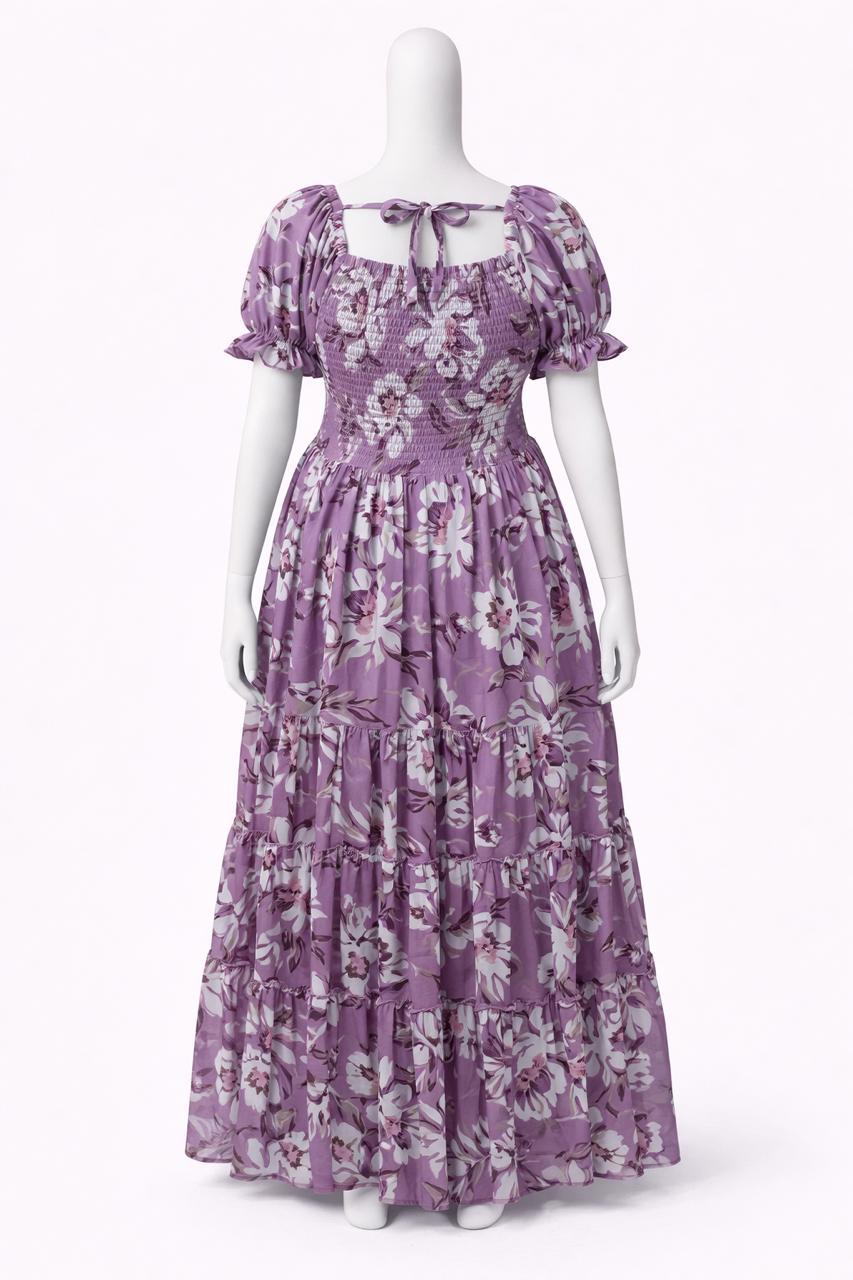 Women's violet floral printed sundress with puff sleeves